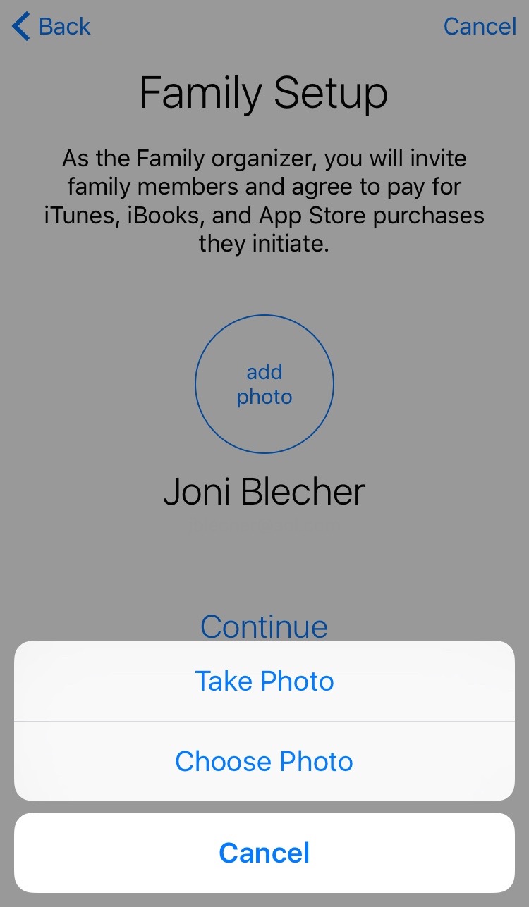 3. Since you’re the first person setting up this feature, you’re the Family Organizer. You can add a photo by tapping Add Photo. You can take a new photo or choose one you already have by tapping Choose Photo. Pick the photo from your album and then tapp Choose. Your photo will appear in the circle on the Set Up Family Sharing screen.