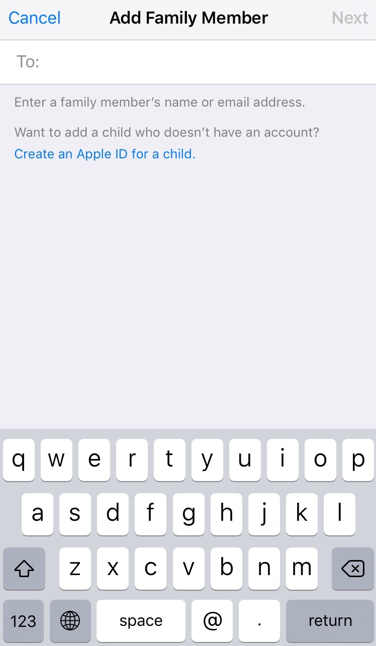 7. It’s time to add family members. Tap Add Family Member… on the next screen. Type in the email address of the person you’d like to add. If you already have this information on your device, it will auto guess the information. Once complete tap Next. You’ll be prompted to input the password associated with your Apple ID account. Repeat the process for each family member you want to add (you can invite up to 5 people).