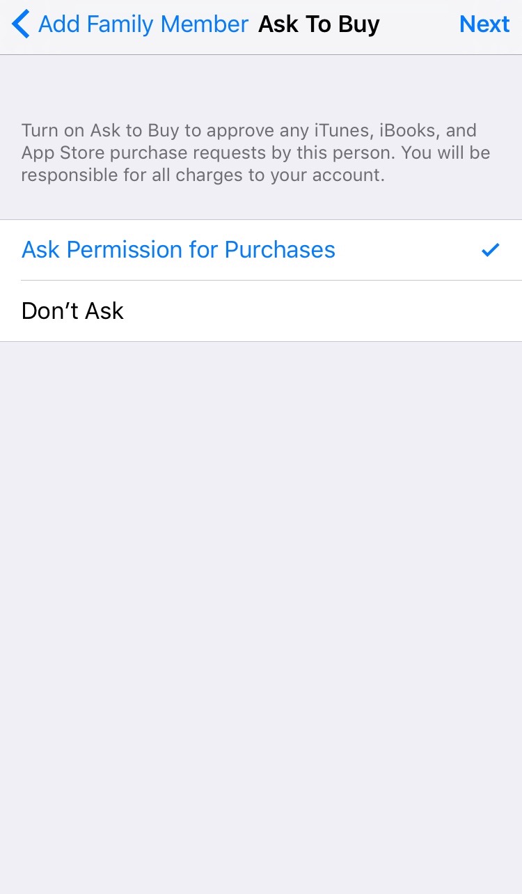 2. The Ask to Buy screen will appear. Simply, tap Ask Permission to Purchases. That’s it! You’ll be notified every time they’d like to purchase an item from iTunes, iBooks, or the App Store.