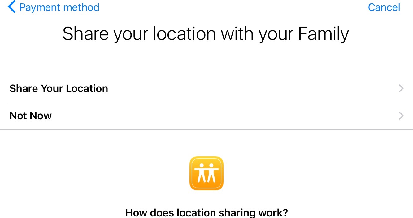 6. Family Sharing also includes the ability to share your location with family members in the group, so they know where you are at all times. If you wish to activate this feature, tap Share Your Location. If you’d rather not share that information, tap Not Now.