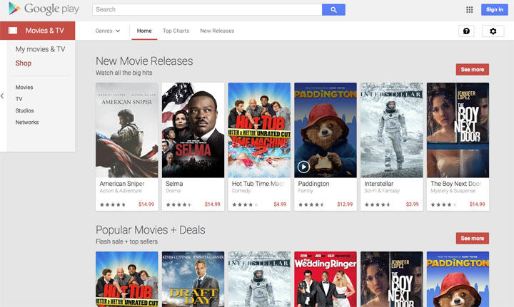 3. Google Play: Perhaps the most basic of all the services listed in this comparison of streaming sites. You can sort through listings by genre, movies, TV shows, studios, networks, top charts, and new releases. There isn’t a family friendly or kid category, though you can select networks to find what’s offered from Disney and Nickelodeon. Speaking of networks, you can also buy HBO, Starz, and Showtime original programs. You can rent or purchase movies and shows and view them in HD using the Chrome web browser Chromecast, Roku, and Android devices.